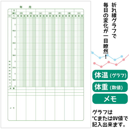 ●本紙の表に数値を入れて線を結ぶと、体温の変化が一目で分かる折れ線グラフが作成できます。