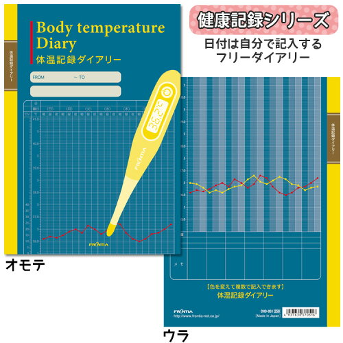 ■商品詳細 ●本体:H257xW182mm ●56ページ ●ワイヤー綴じ ●ウィークリー・日曜始まり ●記入項目:体温グラフ、体重、メモ ●℃またはOV値での値での記入できます。